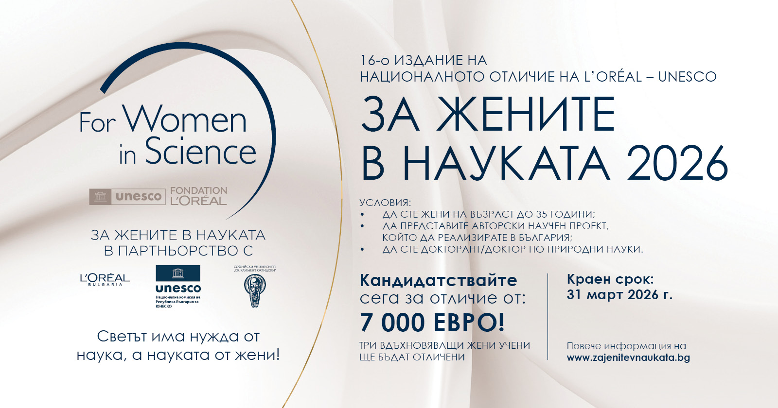 12 март 2026 г., София - Само 20 дни остават до крайния срок за кандидатстване за националните отличия „За жените в науката", които ще подкрепят три млади български изследователки с по 7000 евро за развитието на техните научни проекти. Кандидатури се приемат до 31 март 2026 г., а конкурсът е отворен за жени учени до 35 години, които са докторанти или вече имат защитена докторска степен и работят по изследвания в областта на природните науки.