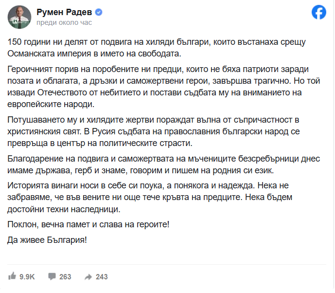 /КРОСС/ "150 години ни делят от подвига на хиляди българи, които въстанаха срещу Османската империя в името на свободата", написа в социалните мрежи президентът на България в периоода 2017 - 2026 и лидер на "Прогресивна България" Румен Радев.