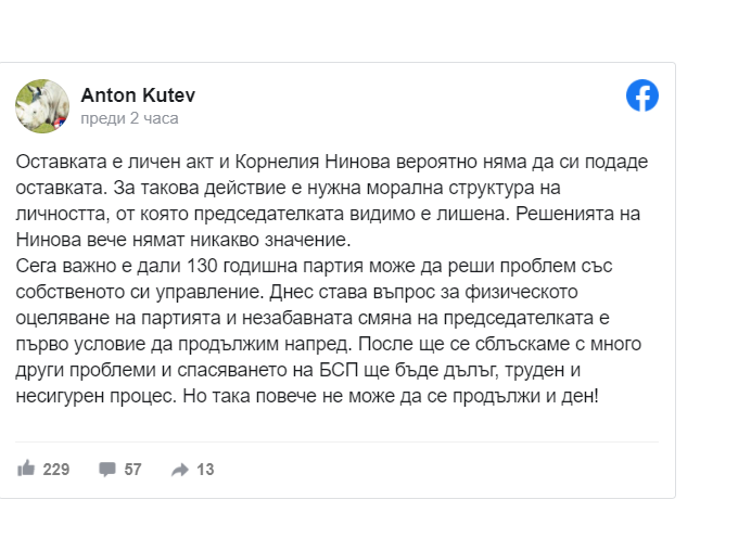 "Сега важно е дали 130 годишна партия може да реши проблем със собственото си управление. Днес става въпрос за физическото оцеляване на партията и незабавната смяна на председателката е първо условие да продължим напред. После ще се сблъскаме с много други проблеми и спасяването на БСП ще бъде дълъг, труден и несигурен процес. Но така повече не може да се продължи и ден", написа още Кутев.