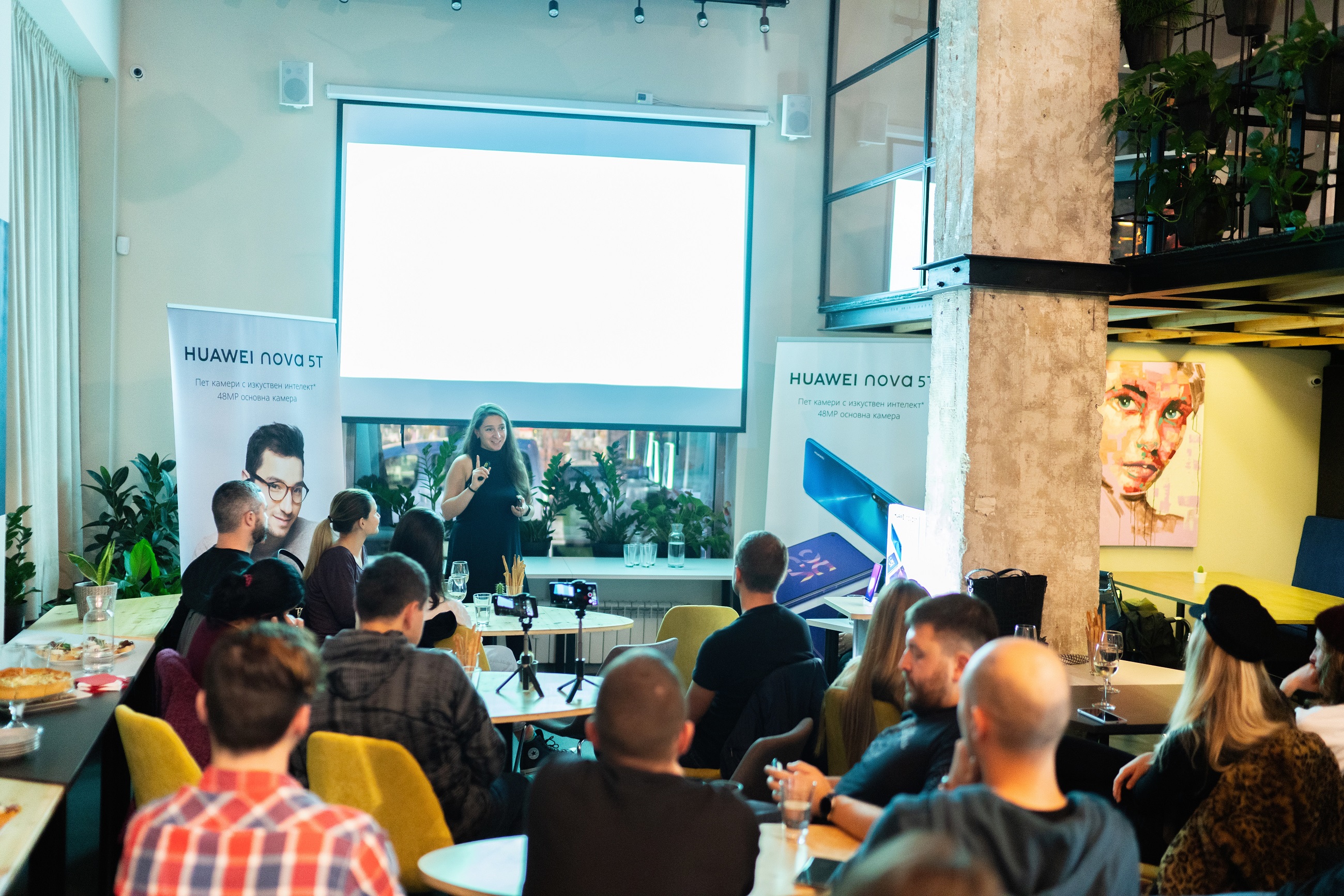 /КРОСС/ На отворен уъркшоп за творческо себеизразяване в социалните мрежи по повод старта на продажбите на новия модерен смартфон Huawei nova 5T, модният фотограф, работещ на българска и международна сцена, и автор на подкаста „The Fashion Photography Podcast„ Virginia Y разкри няколко практически съвети за заснемане на стилни автопортрети с мобилен телефон. Уъркшопът се проведе в разчупеното споделено пространство WORKY | Workspace & Coffee.