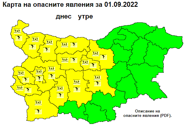 В петък - 2 септември валежите и бурите ще продължат, температурите също ще се понижат и ще бъдат между 22 и 26 градуса, за София 22.