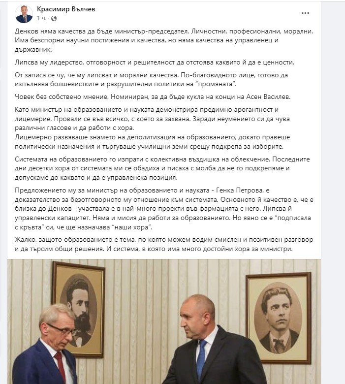 /КРОСС/"Денков няма качества да бъде министър-председател. Личностни, професионални, морални. Има безспорни научни постижения и качества, но няма качества на управленец и държавник", това написа в профила си във фейсбук бившият министър на образованието Красимир Вълчев.