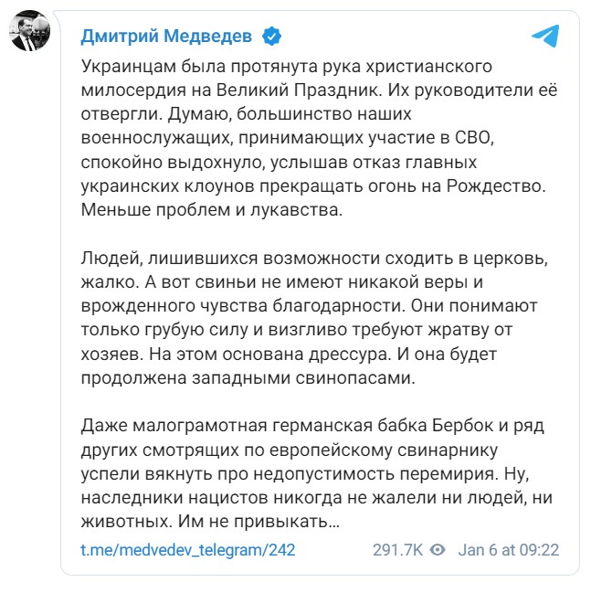 /КРОСС/ Дмитрий Медведев, заместник-ръководител на Съвета за сигурност на Руската федерация, смята, че Киев, отказвайки коледното примирие, предложено от Москва, е отхвърлил „ръката на християнската милост". Въпреки това, добави той, за руските военни в тази ситуация "има по-малко проблеми и хитрости".