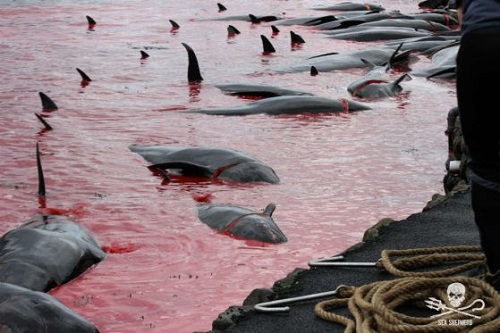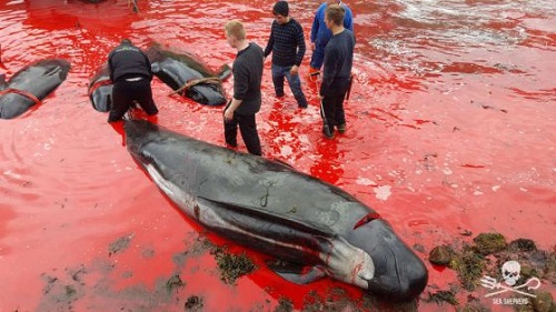Организацията Sea Shepherd Global тайно документира традиционния лов "grindadrap" между юли и септември тази година и току-що пусна серия от снимки от събитието. Според нея най-малко 1203 пилотни кита (или гринда) и 488 делфина са били убити по време на 24 отделни ловни акции през лятото на 2017 г., което я прави една от най-кървавите години от средата на 1990-те години.