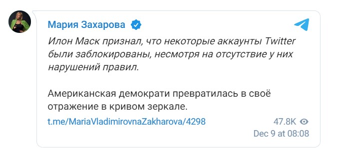 /КРОСС/ Ситуацията с блокирането на акаунти в Twitter демонстрира, че американската демокрация се е превърнала в свое собствено отражение в изкривено огледало. Това написа в петък в канала си в Telegram официалният представител на руското външно министерство Мария Захарова, коментирайки думите на ръководителя на Twitter Илън Мъск, че някои акаунти в социалните мрежи са били блокирани, въпреки липсата на нарушения на правила от тях.