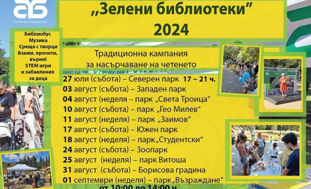 Споделете горещите летни уикенди в прохладата на софийските паркове и с атрактивната програма на юбилейните „Зелени библиотеки 2024" на Столична библиотека!