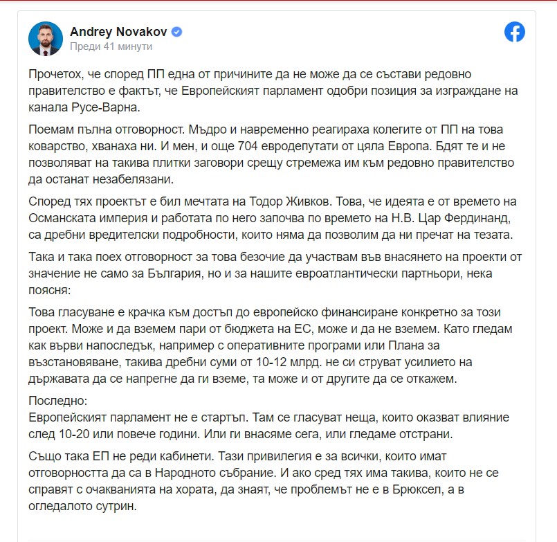 Повод за коментара му е твърдение на ПП, че "една от причините да не може да се състави редовно правителство е фактът, че Европейският парламент одобри позиция за изграждане на канала Русе-Варна".