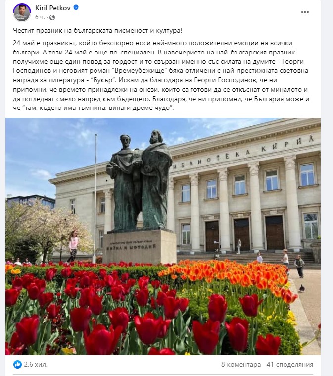 Петков пише още, че в навечерието на най-българския празник сме получили още един повод за гордост и то свързан именно със силата на думите - Георги Господинов и неговият роман "Времеубежище" бяха отличени с най-престижната световна награда за литература - "Букър":