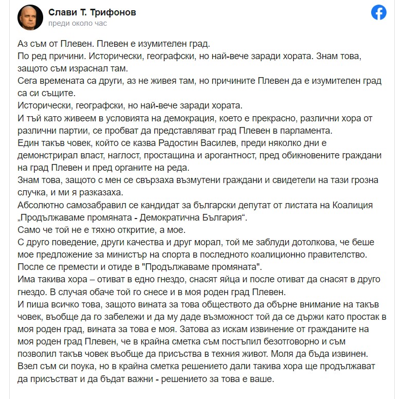 Трифонов поиска извинение от от гражданите на Плевен, че е постъпил "безотговорно" и е позволил "такъв човек въобще да присъства в техния живот".