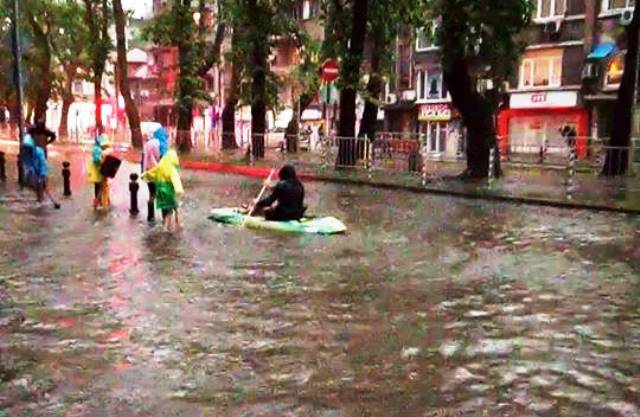 Други зевзеци се пробваха да преплуват града при водни условия и се пуснаха по бул. Руски. Облечени в дъждобрани, шегаджийте очевидно не се притесняваха от водните гейзери, образуващи се от преминаващите автомобили.