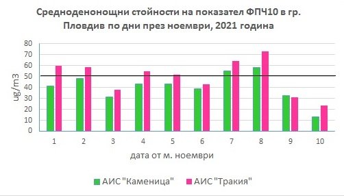 Анализът сочи, че има корелация между това повишаване и наблюдаваните по-ниски температури същите дни и засиленото използване на битово отопление, което е основния източник на влошеното качество на въздуха. Среднодневни превишения по показател фини прахови частици са регистрирани за два дни (7 и 8 ноември) и на двете измервателни станции и за още четири дни - в станция „Тракия". Стойностите на среднодневните превишения варират в диапазона между 51,62 и 73,02 µg/m3.