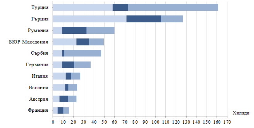 През първия летен месец на тази година най-голям брой пътувания на български гражданиса осъществени към Турция – 160,8 хил., Гърция – 126,7 хил., Румъния – 59,8 хил., Македония – 49,2 хил., Сърбия – 46,8 хил., Германия – 36,5 хил., Италия – 26,7 хил., Испания – 23,6 хил. С цел почивка и екскурзия водещи са били южната ни съседка, следвана от Турция, Македония, Италия и Испания.