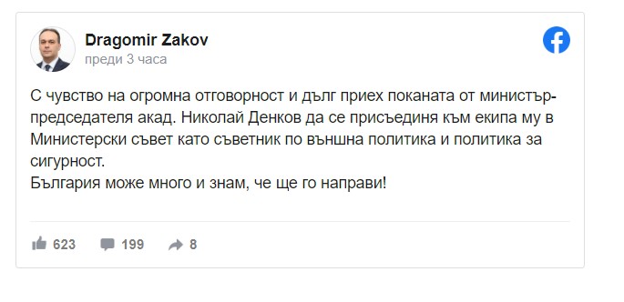 присъединя към екипа му в Министерски съвет като съветник по външна политика и политика за сигурност. България може много и знам, че ще го направи", написа той.