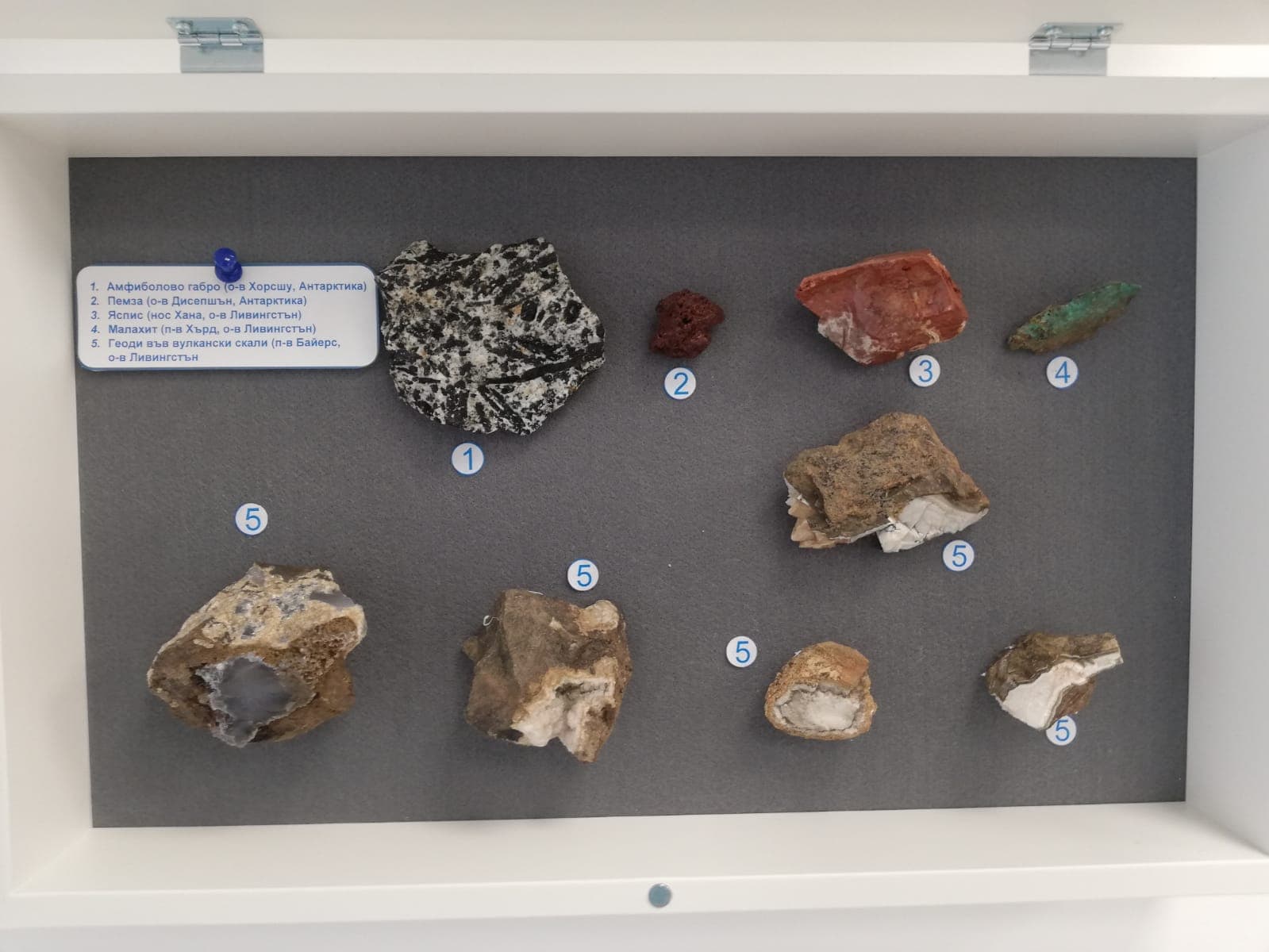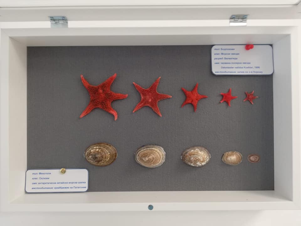 Експозицията представя образци от различни части на Антарктика. В нея са събрани редките миди-ветрила, полярни морски таралежи, красиви червени и жълти морски звезди и антарктически миди. Освен живото богатство на Южния океан, сред експонатите са включени и амонити на 150 млн. години, минерали и вкаменени растения, разказващи историята на Земята.