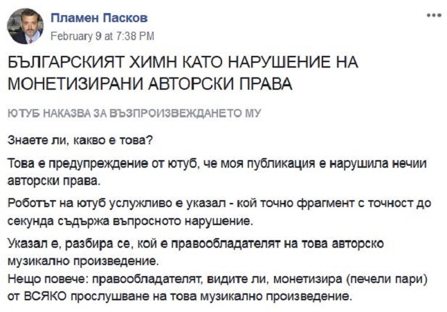 На протеста звучал българският химн, а хората пеели. Пасков заснема видео. По-късно се опитва да качи записа в Youtube. Алгоритъмът обаче му казва, че с качването на въпросния клип има опасност да наруши авторските права на друг човек. Указаното име на правоносителя е Tommy Stig Sune Hansson. По този повод Пасков пише следните редове: ".../Простичко казано, колонизаторът е присвоил авторските права над българския държавен химн, тези права са монетизирани, но не за нас, и не за българи, и същият този колонизатор си е присвоил и упражнява правото си да наказва всеки, който възпроизвежда и дори пее (!!!) този откраднат от него химн на друга държава./