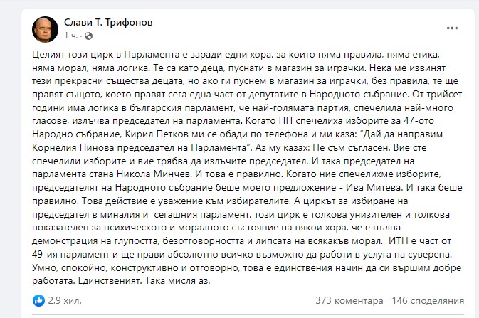 "От трийсет години има логика в българския парламент, че най-голямата партия, спечелила най-много гласове, излъчва председател на парламента. Когато ПП спечелиха изборите за 47-ото Народно събрание, Кирил Петков ми се обади по телефона и ми каза: “Дай да направим Корнелия Нинова председател на Парламента”. Аз му казах: Не съм съгласен. Вие сте спечелили изборите и вие трябва да излъчите председател. И така председател на парламента стана Никола Минчев", разказа Трифонов в пост във фейсбук.