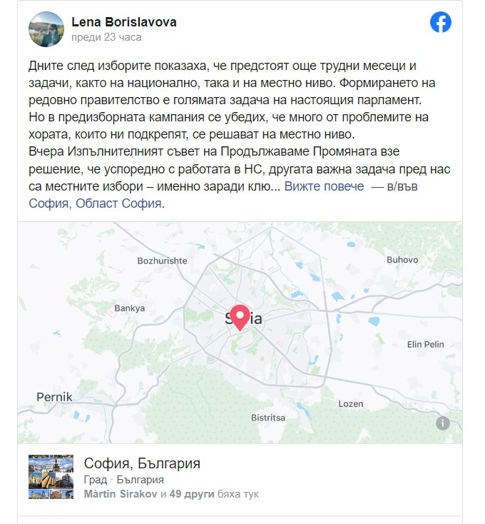 Вчера Бориславова обяви във Фейсбук, че няма да е депутат в 49-ото Народно събрание, а ще се занимава с кампанията за местните избори в София.