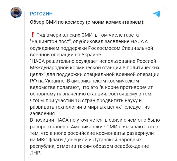 „Именно САЩ политизираха нашето сътрудничество, наложиха незаконни санкции срещу нашите предприятия и редица ръководители (бивши и настоящи) от нашата индустрия, грубо нарушиха принципа „Космос извън политиката“, лишавайки ни от достъп до международния пазар на микроелектроника и търговски поръчки, опитвайки се да задушат руския космос – люлката на световната космонавтика“, написа Рогозин в своя канал в Telegram.