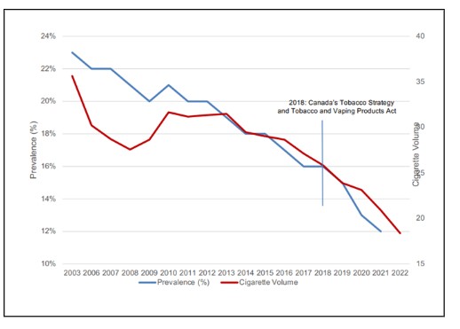Според статистиката между 2021 г. и 2022 г. в Канада се наблюдава безпрецедентен спад от 12% в продажбите на цигари. Нивата на тютюнопушене са намалели от 16% (4,9 милиона) на 12% (3,8 милиона канадци) само в рамките на 3 години от 2018 г. до 2021 г . По-дълъг поглед назад във времето показва, че пушат два пъти по-малко хора, отколкото преди 20 години – от 23% през 2003 г., днес канадците, които палят цигара са под 12%.