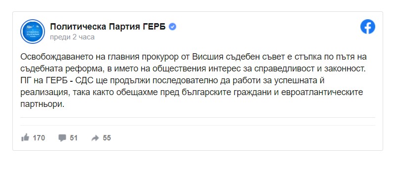 /КРОСС/ "Освобождаването на главния прокурор от Висшият съдебен съвет е стъпка по пътя на съдебната реформа, в името на обществения интерес за справедливост и законност". Това заявиха от ГЕРБ в позиция след решението на ВСС за освобождаване на главния прокурор Иван Гешев.