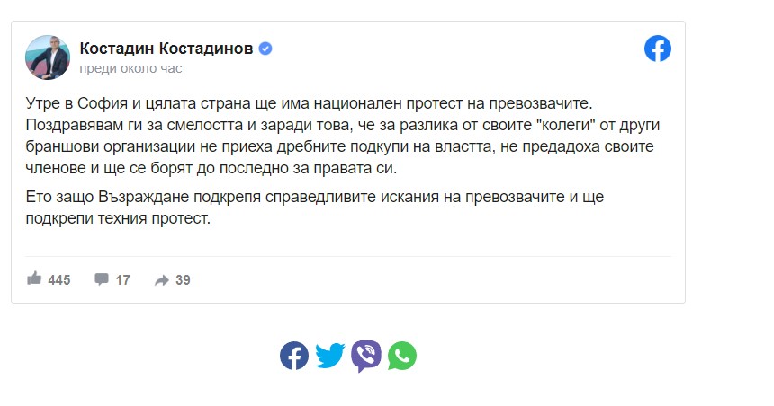 "Ето защо Възраждане подкрепя справедливите искания на превозвачите и ще подкрепи техния протест", уточни Костадинов.