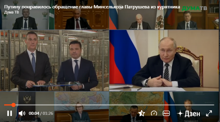 /КРОСС/ Руският президент Владимир Путин похвали министъра на земеделието Дмитрий Патрушев и губернатора на Московска област Андрей Воробьов за това, че са говорили директно от кокошарника край Москва по време на среща на държавния глава с членове на правителството, съобщава РИА Новости.