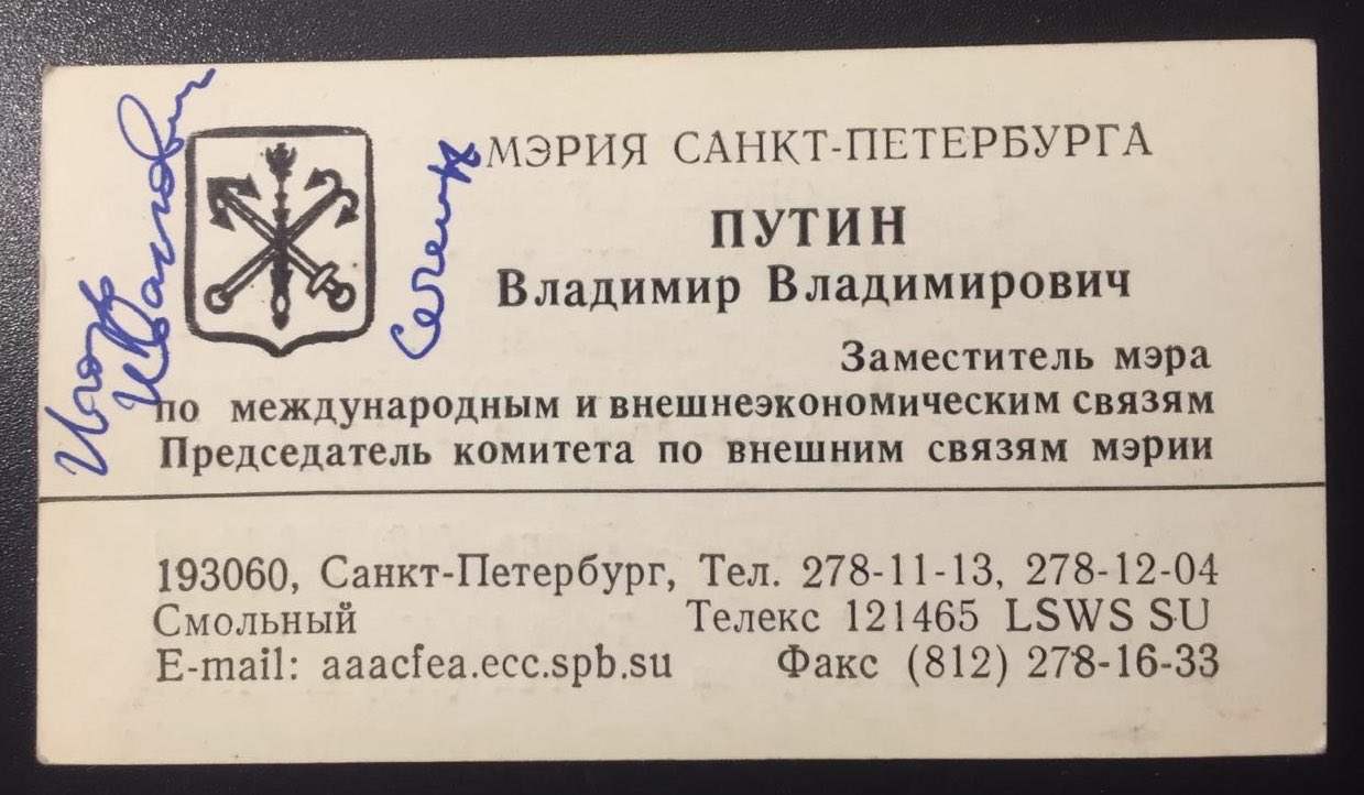 Черно-бялата визитна картичка с герба на Санкт Петербург показва поста на сегашния президент в градската администрация - заместник-кмет по международни и външноикономически отношения, председател на Комитета за външни отношения на кметството. Освен това има координати за контакт.