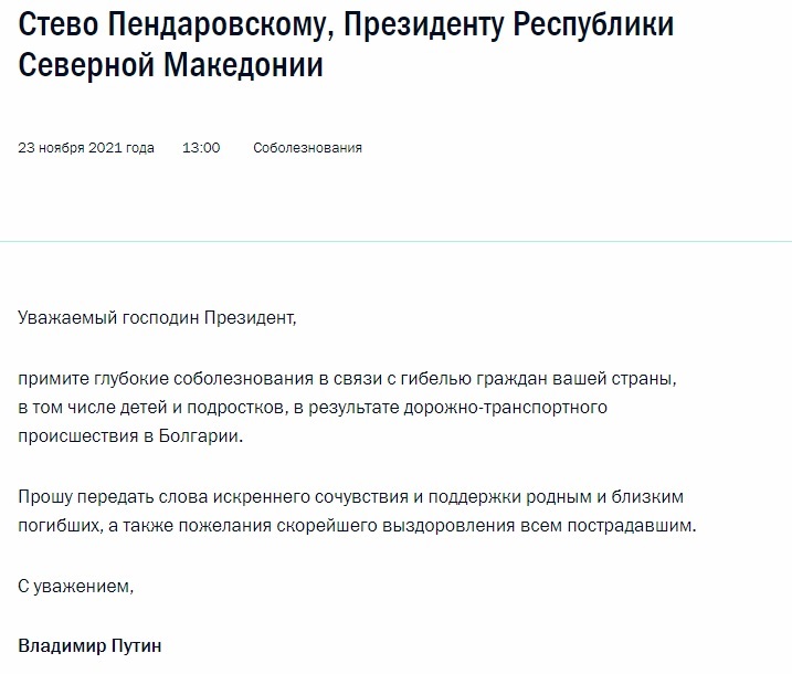 /КРОСС/ Президентът на Русия Владимир Путин изпрати съболезнования до президента на Република Северна Македония Стево Пендаровски по повод гибелта на граждани на тази страна в пътен инцидент на българска територия, предаде ТАСС.