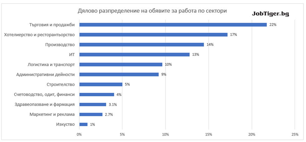 След тях са секторите „Производство" (14%), „ИТ" (13%), „Логистика и транспорт" (10%), „Административни дейности" (9%), „Строителство" (5%), „Счетоводство, одит, финанси" (4%), „Здравеопазване и фармация" (3,1%), „Маркетинг и реклама" (2,7%) и „Изкуство" (1%).