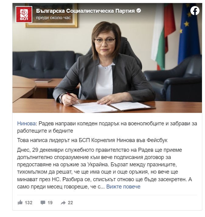 „Днес служебното правителство на Радев ще приеме допълнително споразумение към вече подписания договор за предоставяне на оръжие за Украйна. Бързат между празниците, тихомълком да решат, че ще има още и още оръжия, но вече ще минават през НС. Разбира се, списъкът отново ще бъде засекретен. А само преди месец говореше, че с такъв акт България ще бъде въвлечена във война. И това ли е най-спешно сега? А цената на газ с 35% нагоре от началото на новата година? А на водата с 22%? А цените на храните и основните стоки? Решението на правителството днес трябваше да бъде за увеличение на минималната работна заплата на 50% от средната от първи януари 2023 г. Половин милион българи, които са работещи бедни, чакаха това решение", заяви Нинова.