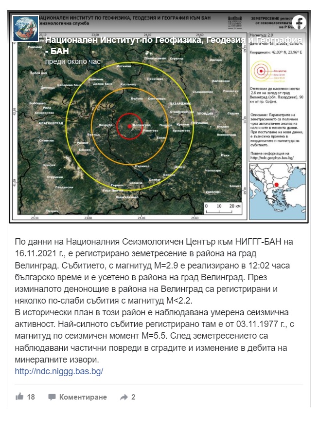 /КРОСС/ Земетресение с магнитуд 2,9 по скалата на Рихтер е регистрирано в района на Велинград в 12:02 часа българско време. То е усетено в района на града, съобщиха от Националния институт по геофизика, геодезия и география към БАН.