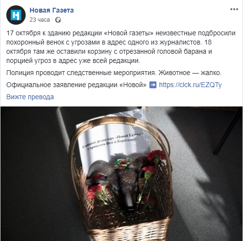 Като причина за това деяние от медията посочват активна кампания срещу „Новая газета” в социалните мрежи, разпространяваща информация, че изданието е разгласило публично данните на руските летци в Сирия, с което е изложила на опасност семействата им.