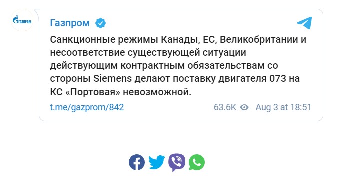 В Телеграм обаче руският газов гигант заяви, че доставката не е възможна.