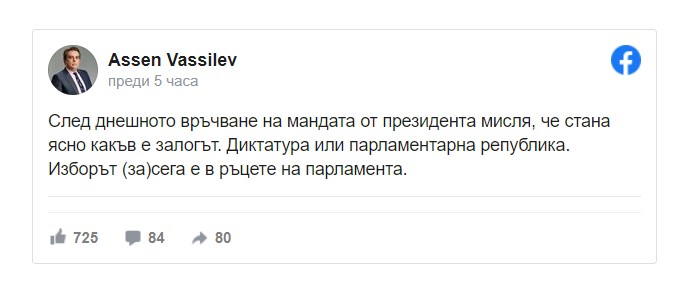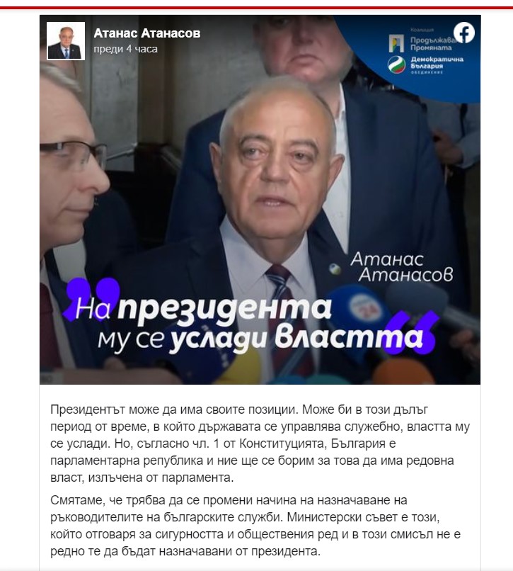 "Съгласно чл. 1 от Конституцията, България е парламентарна република и ние ще се борим за това да има редовна власт, излъчена от парламента", написа в профила си ген. Атанас Атанасов.