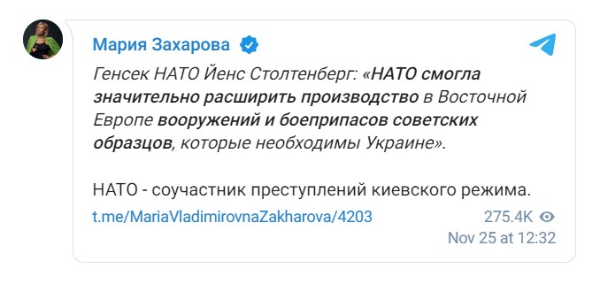 /КРОСС/ Северноатлантическият алианс е съучастник на режима в Киев, каза в петък говорителят на руското външно министерство Мария Захарова.