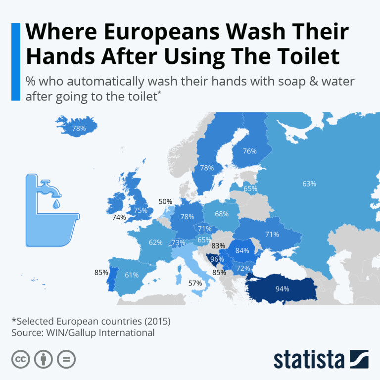 Според проучване на "Галъп интернешънъл" от 2015 г. 72% от българите мият ръцете си със сапун и вода, след като отидат до тоалетната. Оказва се обаче, че въпреки че близо една трета от сънародниците ни си спестяват това усилие, не ние сме най-нечистоплътната нация в Европа в това отношение.