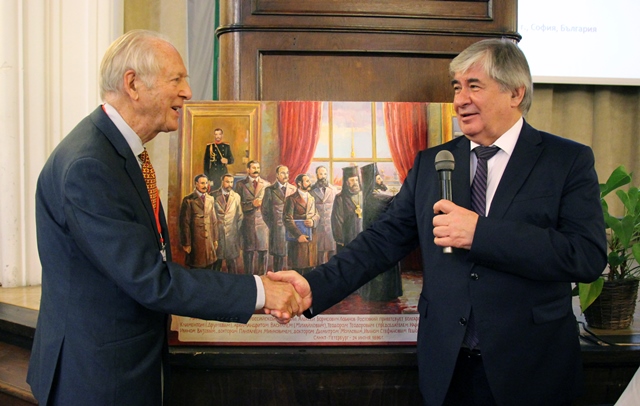 С приятно оживление беше посрещнат един винаги желан гост, който ние виждаме в лицето на княз Никита Лобанов-Ростовски. Проф. Захари Захариев припомни, че семейството на княза е изиграло много важна роля несамо в историята на Русия, но и в историята на българо-руските отношения, но за жалост цената, която е платило в онези трагични години след 1917 г. и след Втората световна война, не е никак малка. Но днес потомъкът на рода Лобанови-Ростовски, Никита, е един от стълбовете на руската диаспора в света и поддържането на връзки с майка Русия, но не е пропускал да работи и за развитието на българо-руските отношения. С особено вълнение князът се обърна към присъстващите в зала „Марин Дринов", като не пропусна в своя характерен стил да подреди до приятелите и тези, които се смятат за неприятели. Никита Лобанов-Ростовски каза, че се обръща към посланика на Русия у нас Анатолий Макаров с мисията да дари на амбасадата копие на картина, посветена на посещението на българска делегация при министъра на външните работи на Руската империя. На платното е изобразен мигът, в който министърът на външните работи целува ръката на митрополит Климент, водач на делегацията, дошла да помоли Русия да установи дипломатически отношения с България. Защо е нарушил протокола и му е целунал ръката? Защото е уважавал митрополит Климент заради негова възвишена духовност и интелектуалния му потенциал и защото и той е лежал в български затвор, защото е бил радетел за отношения с Русия. „Надявам се, г-н посланик, че тази картина ще бъде окачена в залата на руското посолство, за да помнят всички посетители, че България се е утвърдила като единна и свободна страна" - каза княз Лобанов-Ростовски. Посланик Макаров прие дара и обеща,че картината ще намери своето достойно място на стените на посолството. Ще припомня само, че през март, когато в България беше отбелязана 140-годишнината от подписването на Константинополския договор, под който подпис е сложил прапрадядото на княз Никита Лобанов-Ростовски, тогава посланик в Османската империя княз Алексей Лобанов-Ростовски. Тогава Никита Дмитриевич направи дар на посолството на Русия в София копие на картината, изобразяваща момента на подписването на договора.
