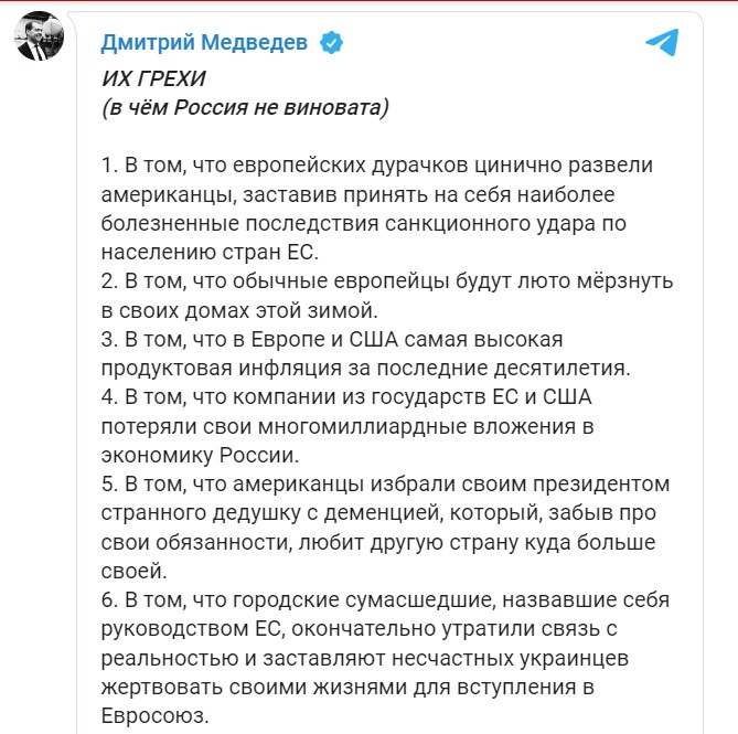 /КРОСС/ НАТО продължава, противно на логиката и здравия разум, да се приближава до границите на Русия. Това заяви заместник-председателят на Съвета за сигурност на Русия Дмитрий Медведев. В четвъртък той публикува пост в канала си в Telegram, озаглавен: "Техните грехове. За какво не е виновна Русия", което е логично продължение на ироничния пост за "греховете", които Западът приписва на Москва.