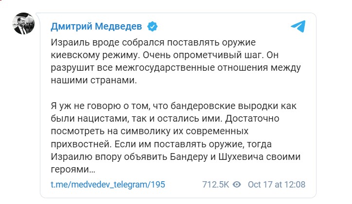 /КРОСС/ Дмитрий Медведев, заместник-ръководител на Съвета за сигурност (СБ) на Руската федерация, е убеден, че Израел прави грешка, като възнамерява да достави оръжие на Украйна, тази стъпка ще разруши междудържавните отношения с Русия. Това мнение той изрази в своя канал в Telegram в понеделник.
