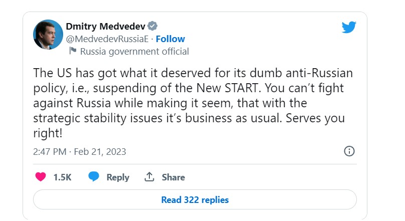 „САЩ получиха заслуженото за своята глупава антируска политика, тоест спирането на СТАРТ-3. Не можете да воювате с Русия, докато се преструвате, че всичко все още е наред с въпросите на стратегическата стабилност. Това е, което вие нужда", написа Медведев в Twitter.