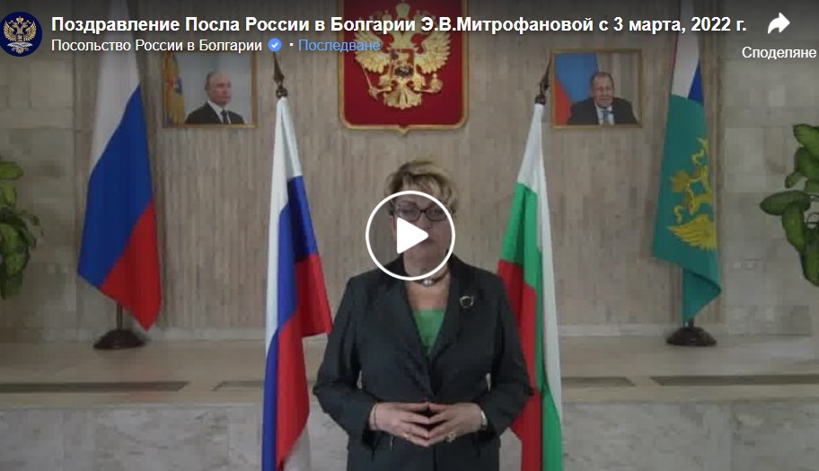 Митрофанова обяснява, че при това положение Русия е нямало как да се примири. „Това е в противоречие с нашите хуманни и християнски ценности. В този ден бих искала да призова българските граждани да се замислят и да погледнат на случващото се в Украйна обективно, без техният поглед да бъде замъгляван от течащата пропаганда. В момента в Украйна се води специална военна операция за демилитаризация и денацификация на престъпниците от киевските власти, които от 2014 г. водят война срещу собствения си народ”, допълва тя.