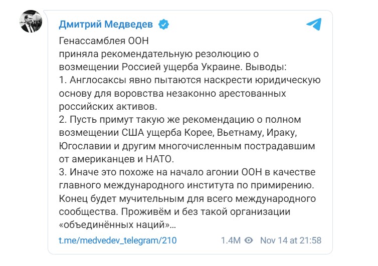 „Те трябва да приемат същата препоръка за изплащане на пълни репарации, които САЩ нанесоха на Корея, Виетнам, Ирак, Югославия и много други страни, които пострадаха от американците и НАТО", написа Медведев в своя канал в Telegram, коментирайки гласуването на ООН за Резолюцията признава необходимостта от създаване на механизъм, чрез който Русия да плаща военни репарации на Украйна.