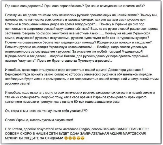 Потишняк написа: „Къде е нашето самоуважение? Защо не размазваме с танкове всичките етнически руснаци, живеещи на наша земя? Защо най-накрая не започнем да ги горим всичките в газови камери".