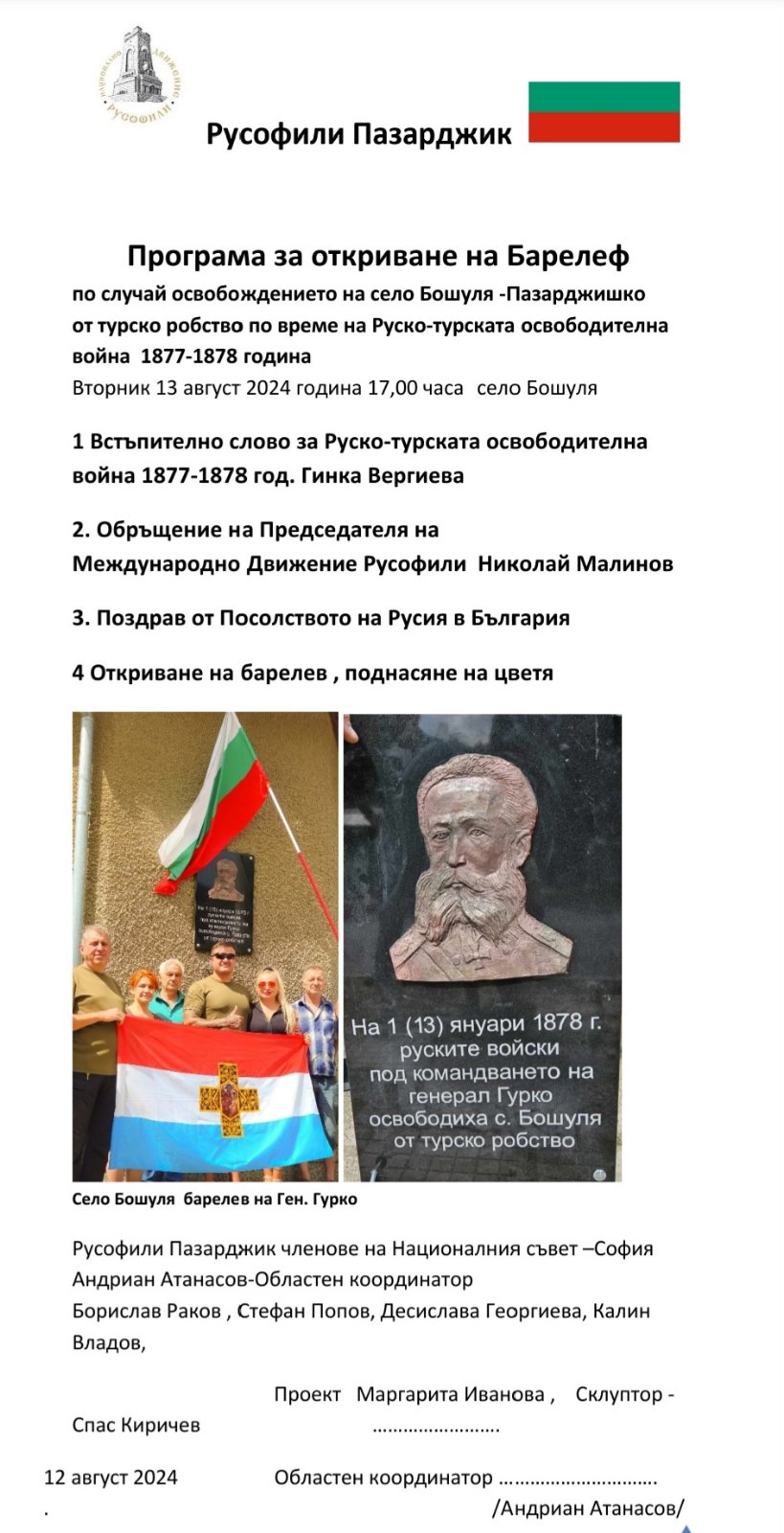 Кампания на НД „Русофили”: Откриване на барелеф в Пазарджик (програма)