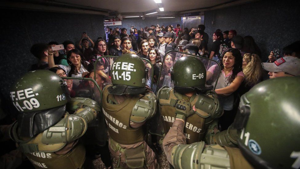 Безредиците в чилийската столица избухнаха заради намерението на правителството да повиши цената на билета. И независимо, че президентът Себастиан Пинера реши да отмени решението си, протестите продължиха. В страната беше обявено извънредно положение , а по улиците на Сантяго бяха изпратени военни и танкове.