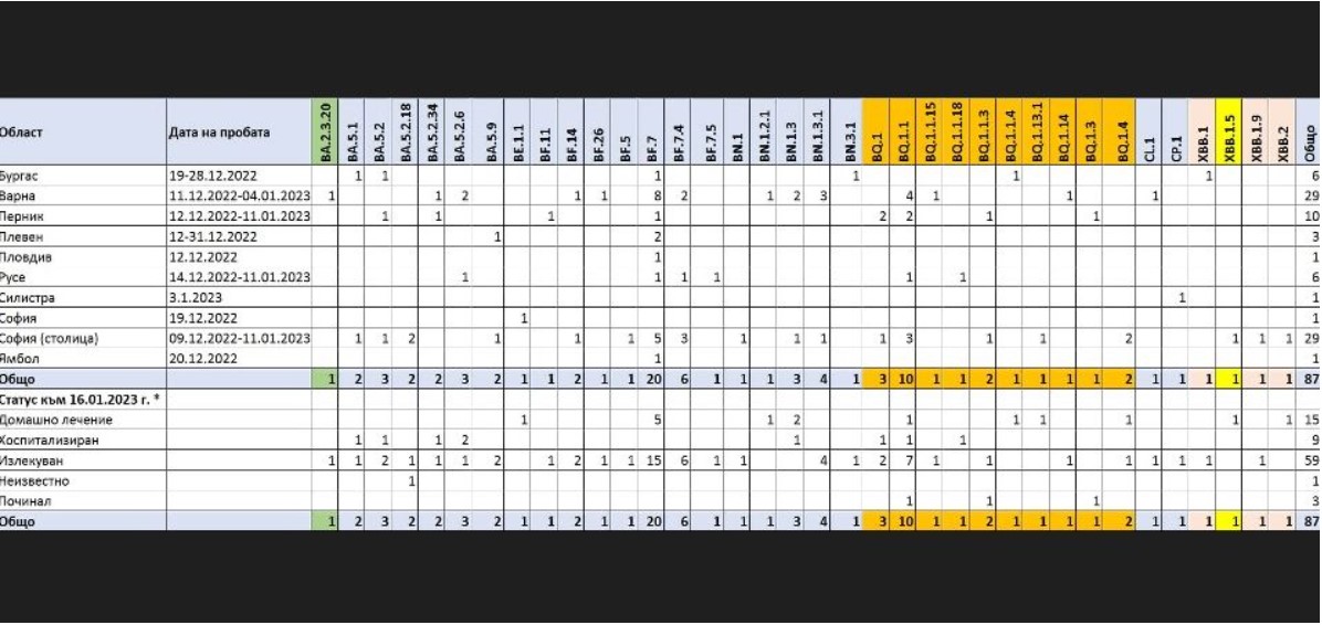 От там уточняват още, че чрез целогеномно секвениране от ново поколение са успешно анализирани 87 клинични проби със SARS-CoV-2. Пробите са взети от пациенти с COVID-19 в периода 09.12.2022-11.01.2023 г. и са изпратени от 14 различни лечебни заведения от 10 области на страната.