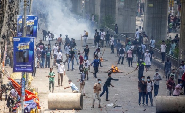 Стотици демонстранти се сблъскаха с полицейските сили за борба с безредиците, които стреляха по тях с гумени куршуми. Протестиращите са преследвали полицаите, които са се укрили в централата на Бангладешката телевизия (Би Ти Ви) в столицата Дака.