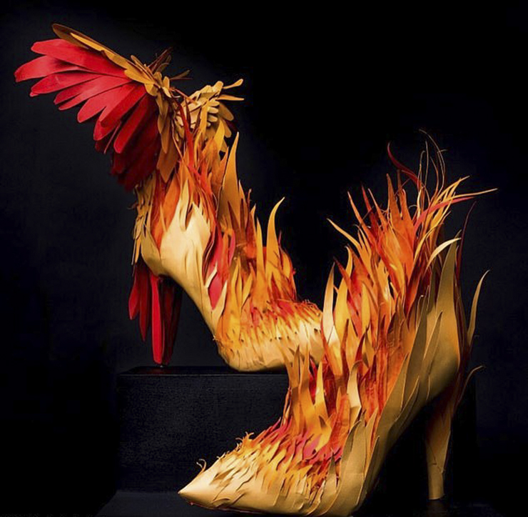 Сега тя сложи обувки, наподобяващи феникс. Те са дело на дизайнерката Кейтлин Дохърти и носят името „кураж“, както между другото се казва и новият албум на Селин.