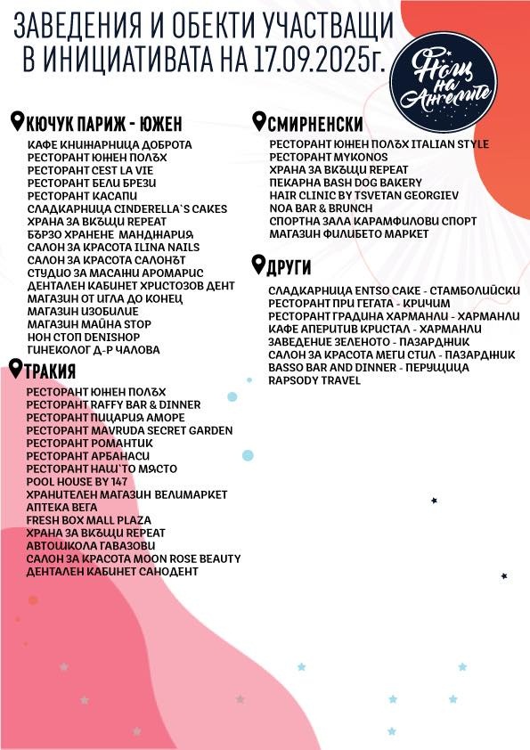 Ако по някаква причина сте пропуснали фестивала или просто вярвате в заразяващата сила на доброто, вземете приятелите си и излезте на обяд или вечеря, посещавайки някой от маркираните със стикер „Нощ на Ангелите" обекти. Така ще станете част от благородната кауза, защото 100% от дарените ще дарят надежда и средства за лечение на три деца и две смели жени.
