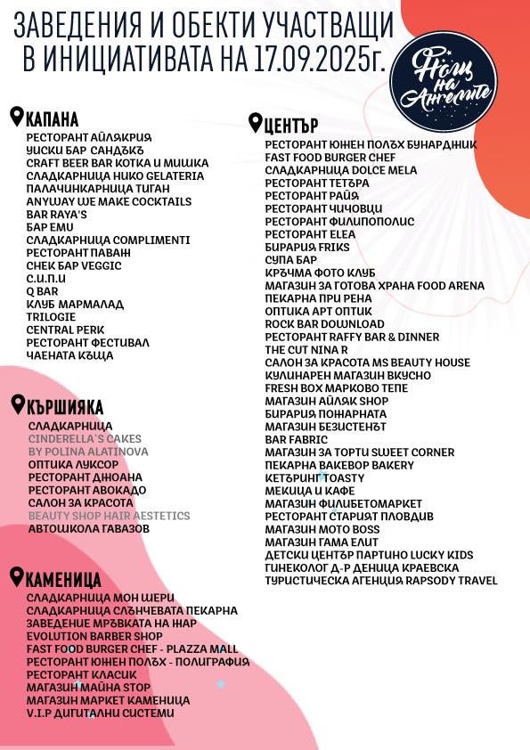 /КРОСС/ Инициативата продължава и на 17 септември, в деня на Вяра, Надежда и Любов , в който 120 заведения в Пловдив ще дарят процент от оборота си